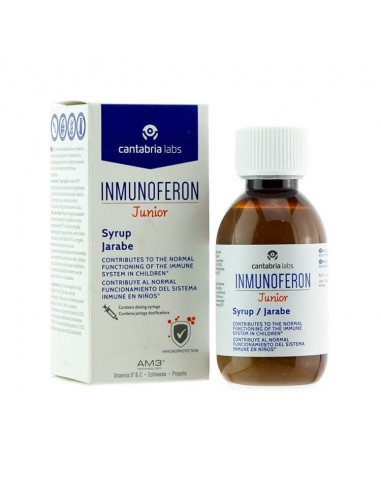 INMUNOFERON Junior Jarabe es una fórmula exclusiva para niños a base de la tecnología AM3® (tecnología patentada por Cantabria Labs con alfa glucomanano fosforilado y proteína de soja) y enriquecido con próspolis y equinácea, además de vitamina C y vitamina D, que contribuyen al normal funcionamiento del sistema inmune en niños.